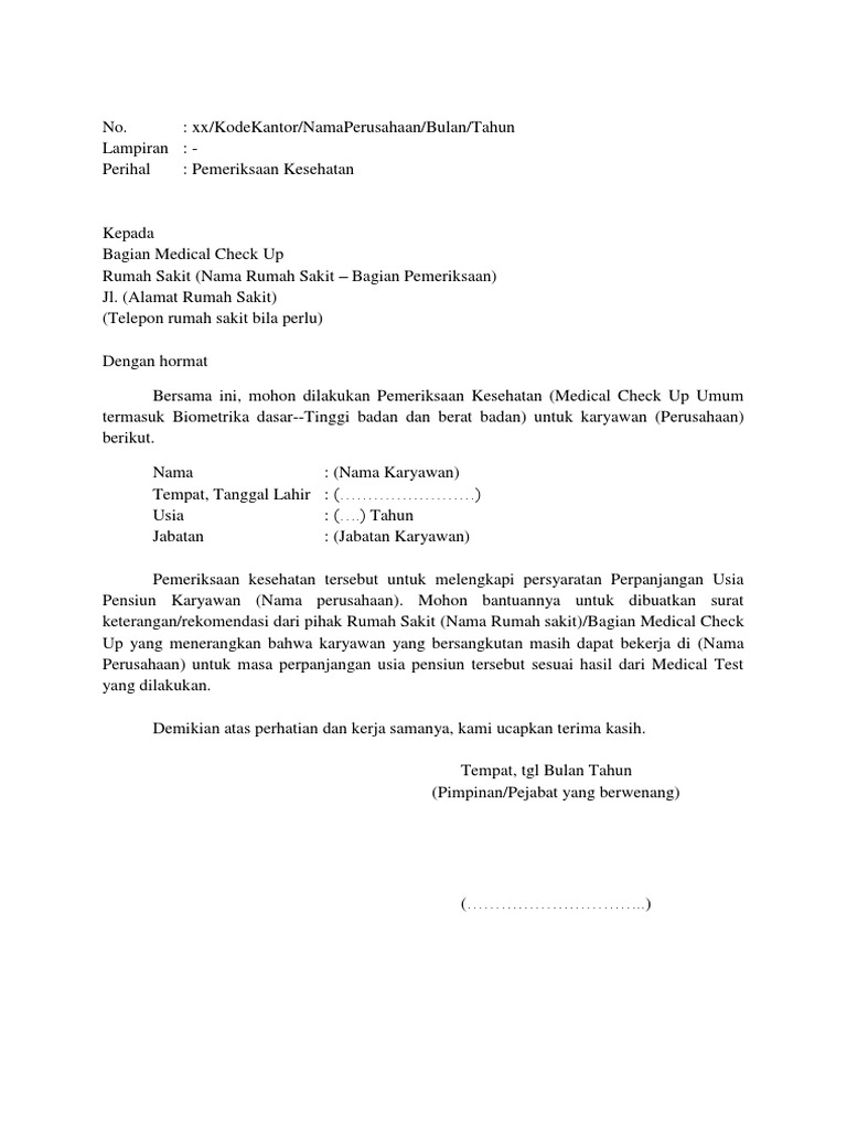 Surat keterangan dari rumah sakit (jika meninggal di. Demikianlah pembahasan yang dapat kami sampaikan mengenai contoh surat pengantar medical check up. Pada umumnya jika kita mau melanjutkan pendidikan tinggi, ke luar negeri khususnya, maka kesehatan fisik maupun rohani mutlak diperlukan.