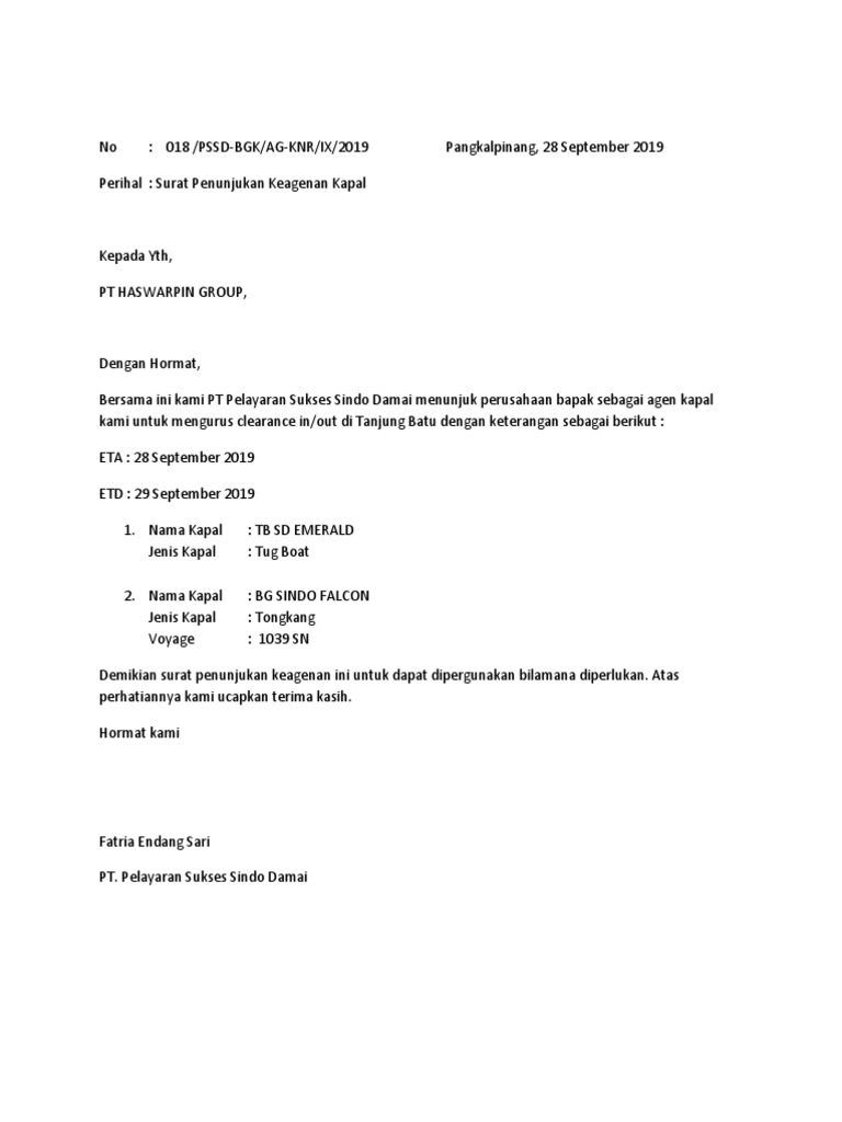 Contoh surat penunjukkan keagenan kapal. 05092015 pelayaran athalla putra cipunagarabahwa berdasarkan surat penunjukan ini yang bersangkutan berhak atas statusnya. Dalam tramper services, penunjukan agen.
