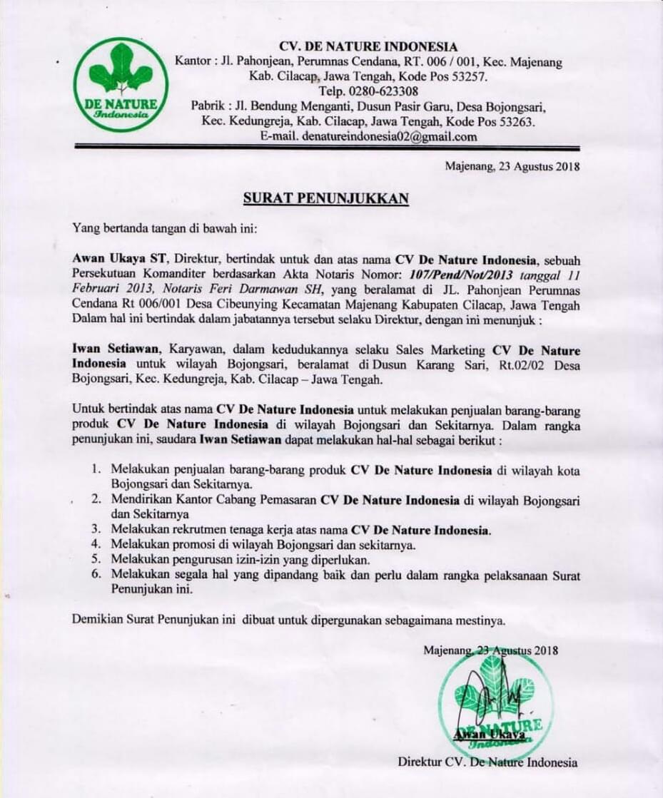 Surat Penunjukan Rekening Agen Resmi Pt De Nature Indo
