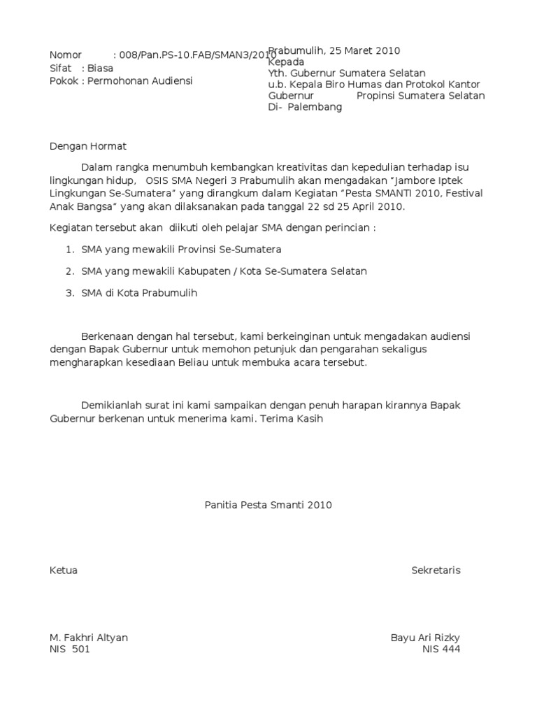 Yang artinya kegiatan itu resmi diketahui kampus dan tidak liar. Permohonan dukungan dan permohonan audiensi kepada gubernur daerah. Contoh surat permohonan audiensi umum yang baik dan benar dimana.