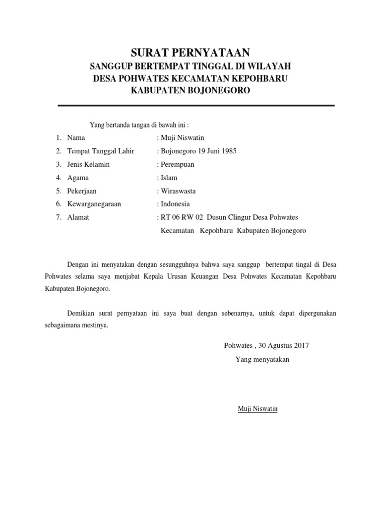 Surat Pernyataan Sanggup Bertempat Tinggal Di Wilayah Desa Setempat - Bagi Contoh Surat