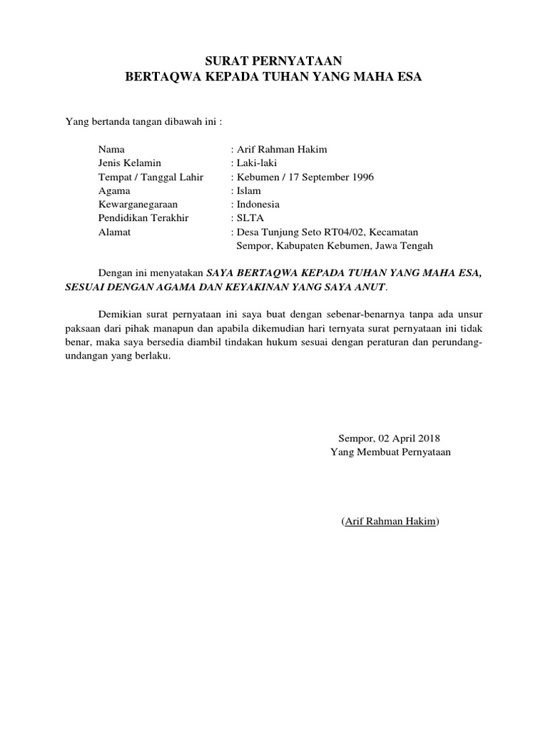 If you continue browsing the site, you agree to the use of cookies on this website. Surat pernyataan bertaqwa kepada tuhan yang maha esa. Contoh surat pernyataan sanggup bertempat tinggal.