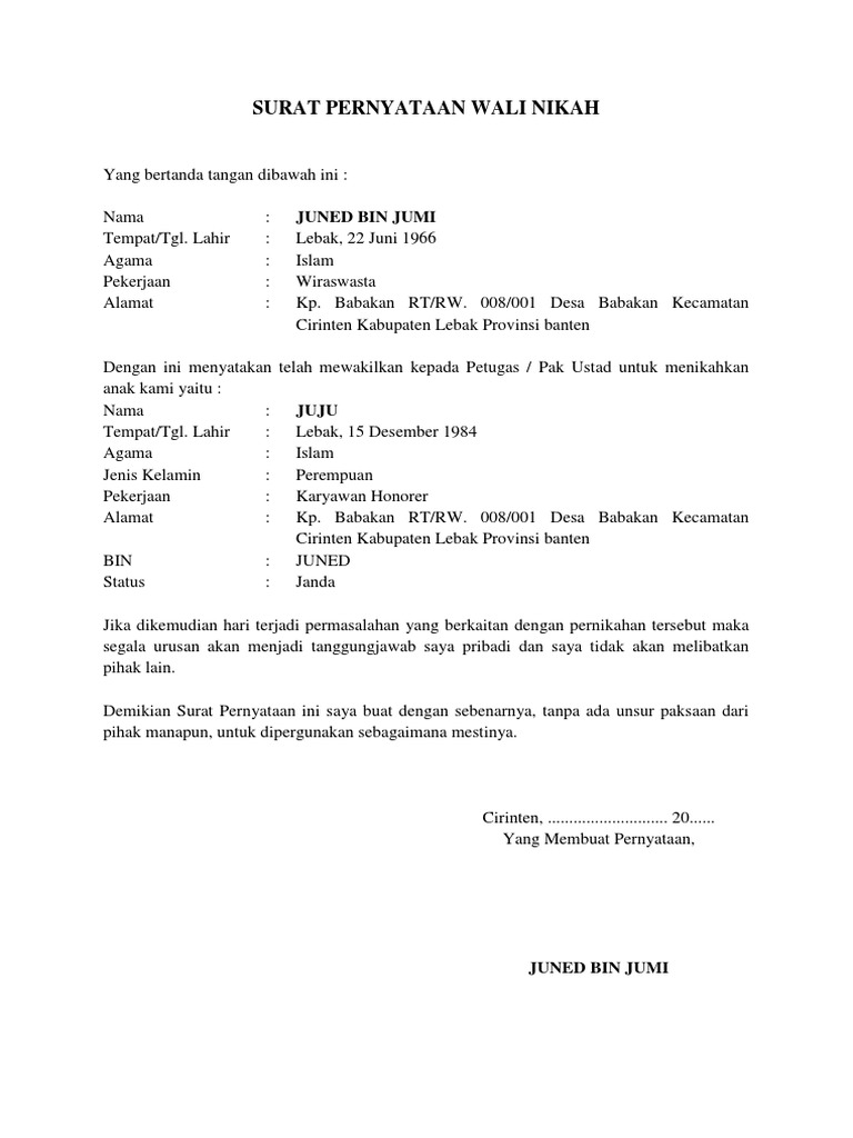Surat keterangan wali nikah nomor : Contoh surat pernyataan menjadi wali nikah isi dari surat pernyataan menjadi wali nikah ini harus jelas dan lengkap, harus ada biodata yang akan dinikahkan dan yang menjadi wali nikah. Surat pernyataan wali nikah ditanda tangani di atas meterai dan diketahui oleh kepala desa atau lurah.