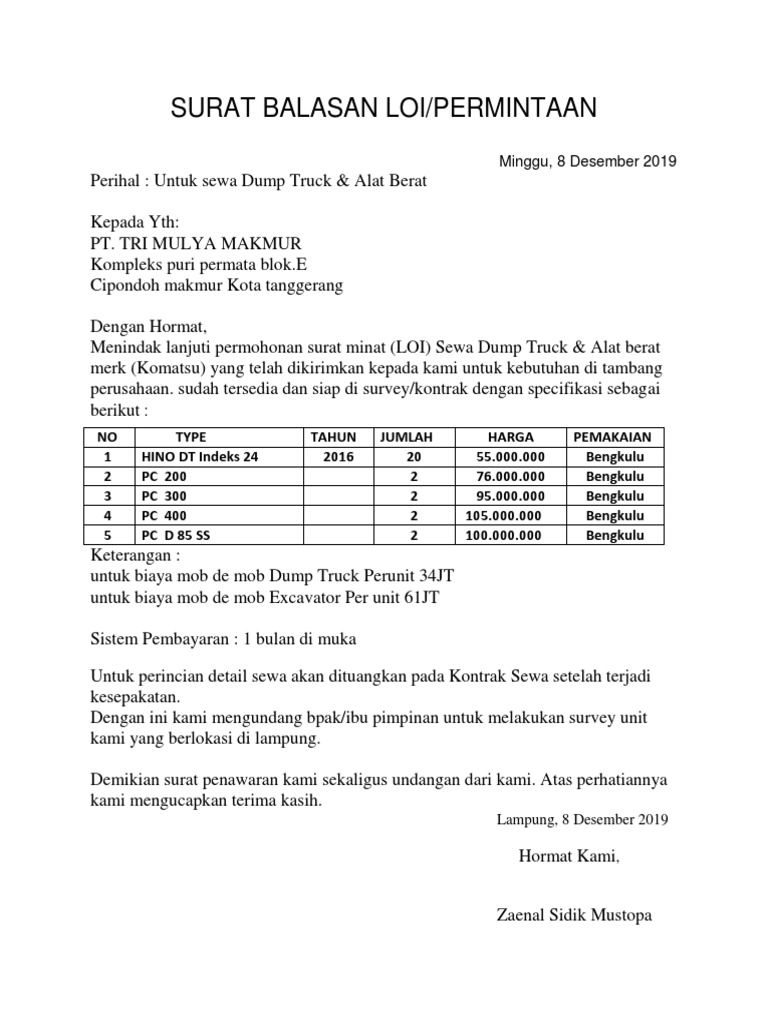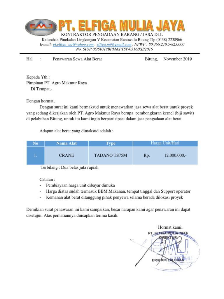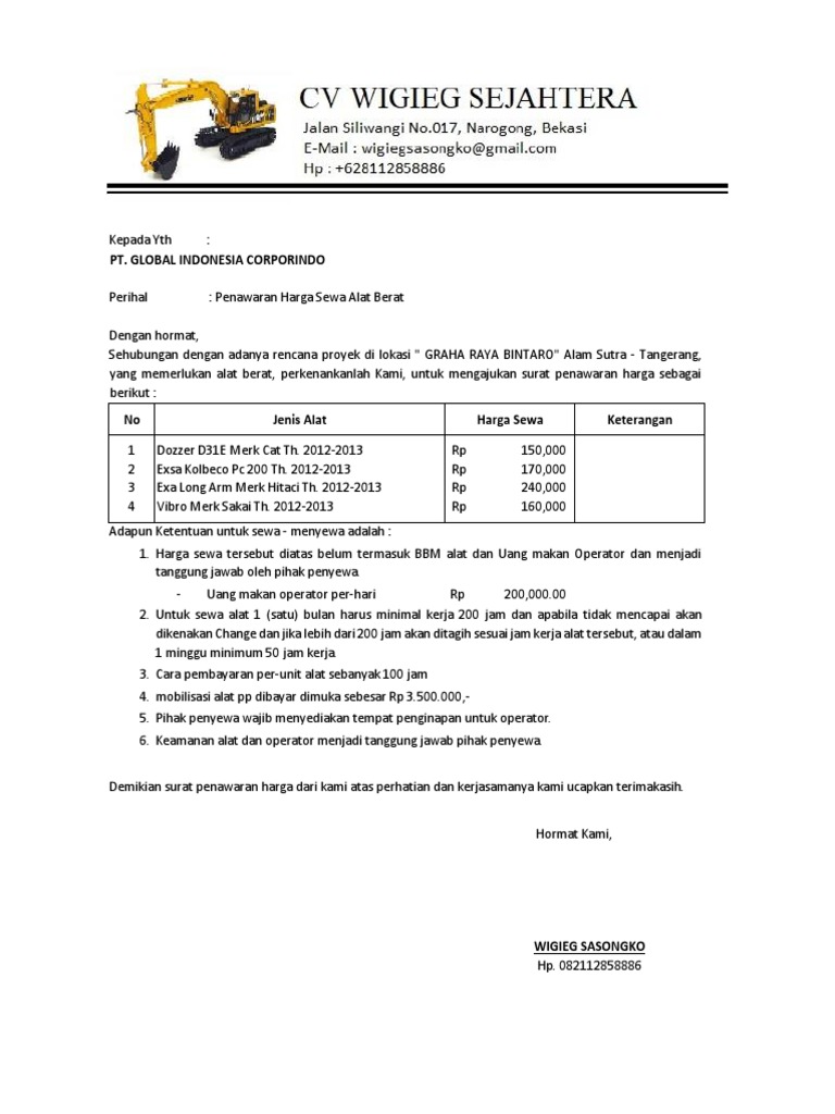 Contoh surat penawaran harga penyewaan alat berat 16 oct 2019.