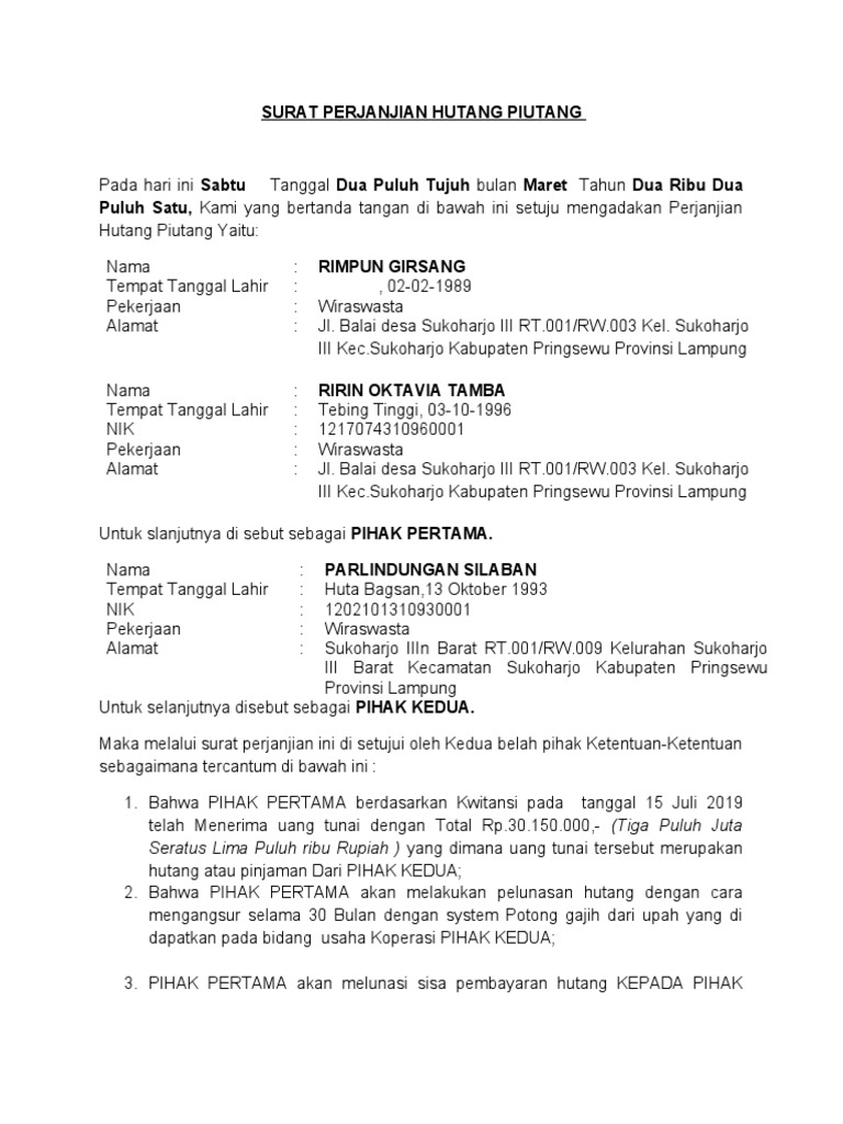 Surat Perjanjian Hutang Piutang Pdf