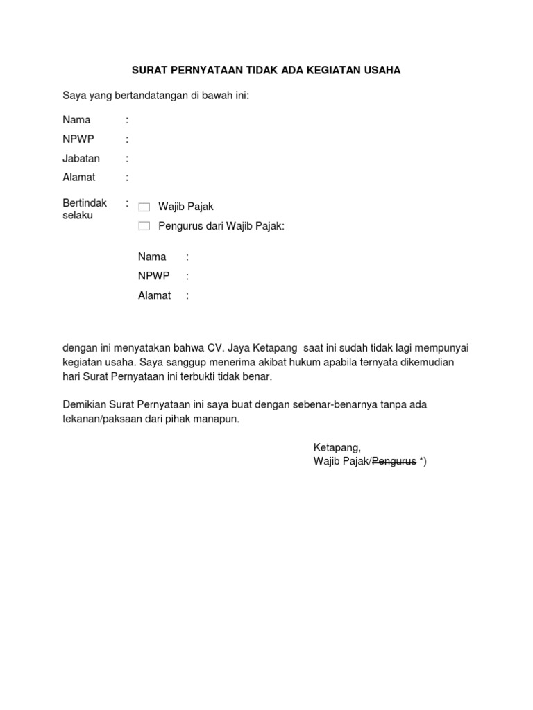 Surat pernyataan tidak ada kegiatan usaha. Contoh surat pernyataan tidak mempunyai kegiatan usaha. Jaya ketapang saat ini sudah tidak lagi mempunyai kegiatan usaha.