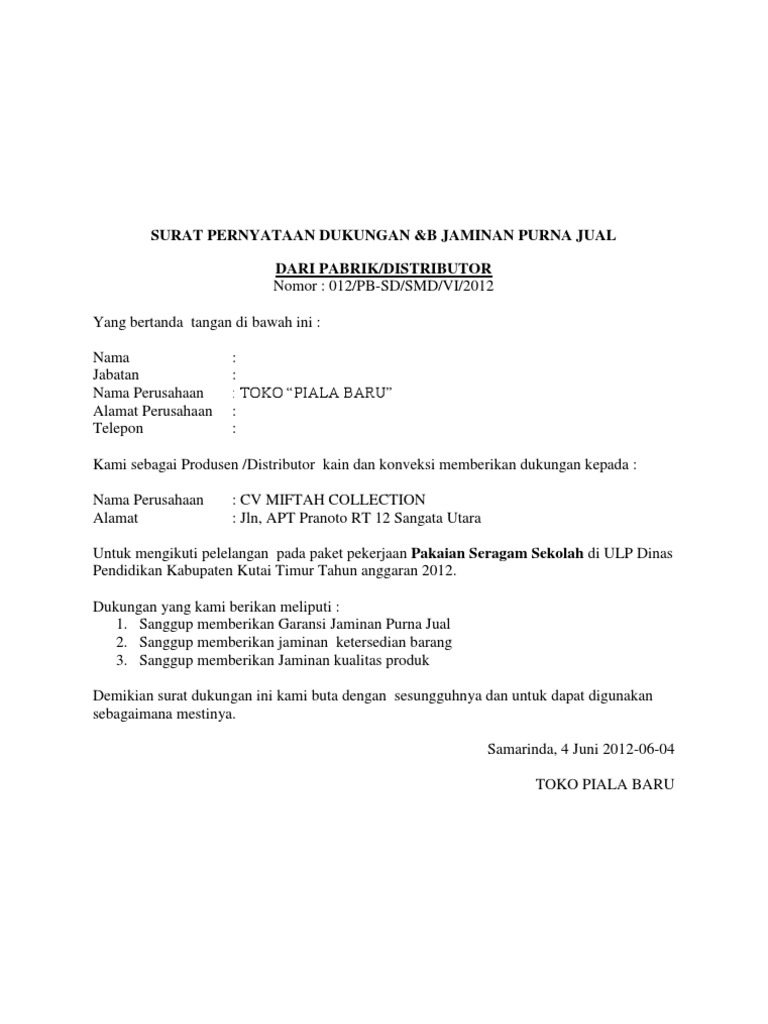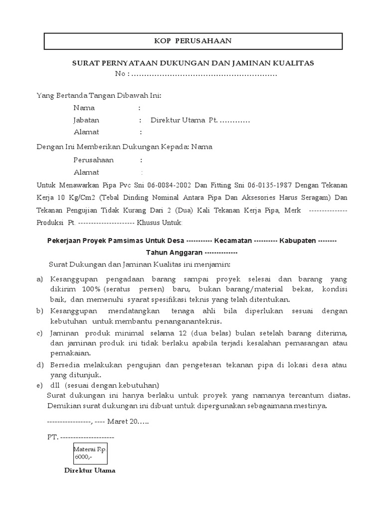 Surat Pernyataan Dukungan Dan Jaminan Kualitas Pdf