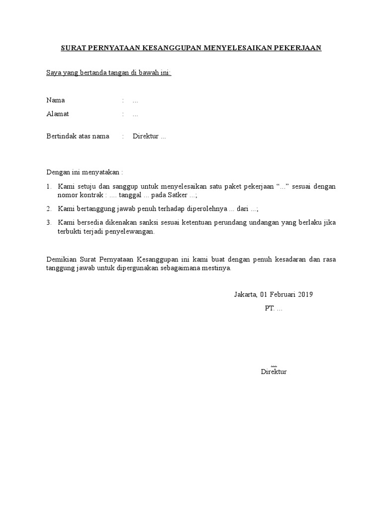 Biasanya surat pernyataan kesanggupan kerja ini dibuat untuk mereka yang ingin bekerja pada sebuah instansi ataupun mereka yang akan dipindahkan dalam. Contoh surat pernyataan kesanggupan diri kerja contoh surat pernyataan kerja 1 surat pernyataan saya yang bertandatangan dibawah ini. (2) surat pernyataan kesanggupan sebagaimana dimaksud pada ayat (1) huruf b paling sedikit memuat: