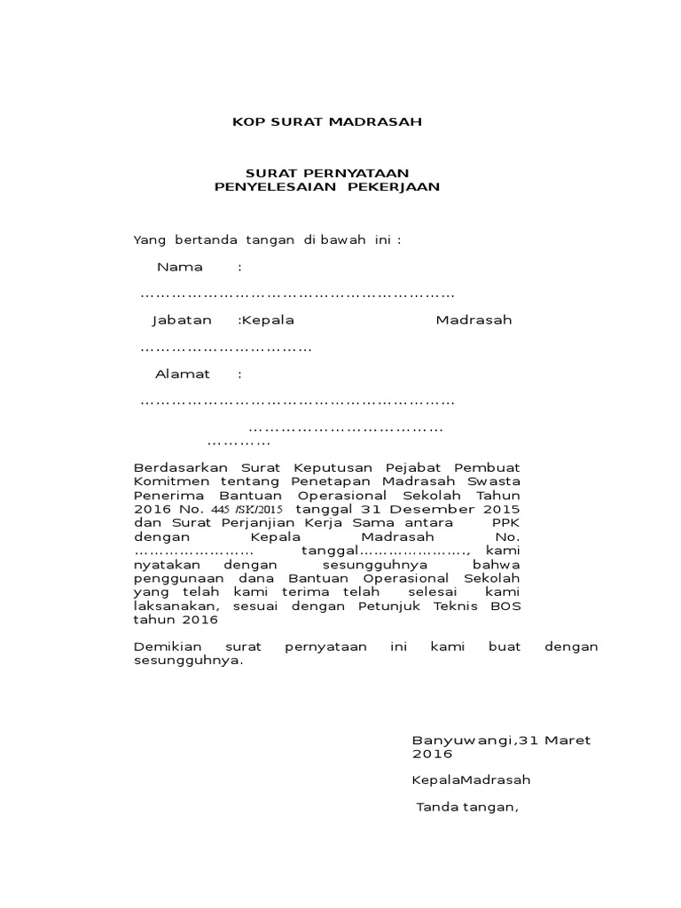 Surat Pernyataan Penyelesaian Pekerjaan Pdf