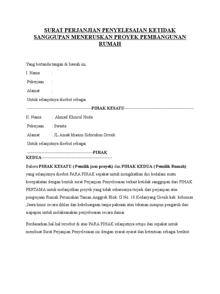 Surat Perjanjian Ketidak Sanggupan Meneruskan Proyek Pdf