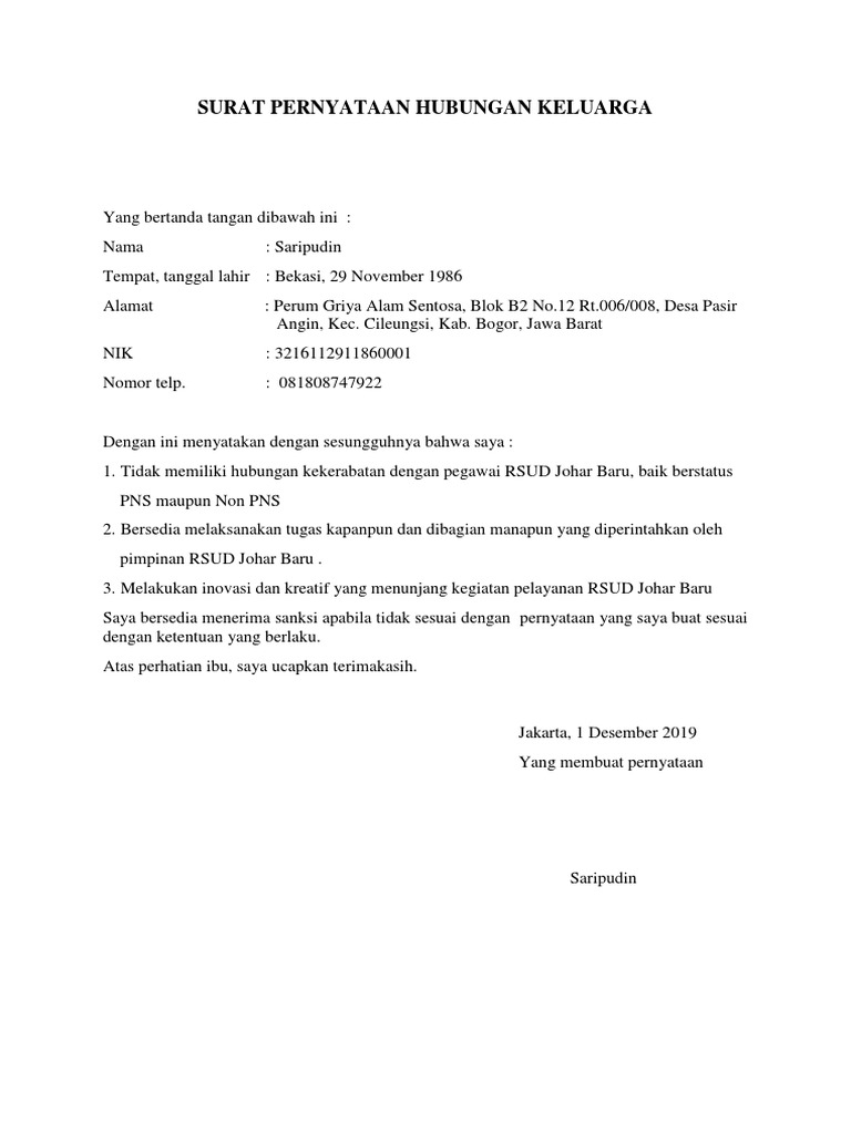 Contoh Surat Pernyataan Tidak Ada Hubungan Keluarga Dengan Pegawai
