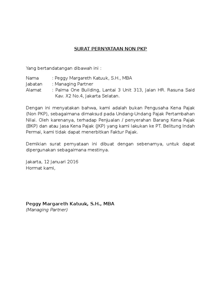 Tambahkan juga dengan keterangan tempat dan tanggal pembuatan surat disertai tanda tangan pimpinan perusahaan dan dilengkapi dengan meterai sebagai bukti legalitas surat pernyataan non. Npoptkp adalah nilai perolehan obyek pajak tidak kena pajak dimana untuk kota depok untuk transaksi selain waris atau hibah wasiat sebesar rp. Tidak termasuk pengusaha bisnis perusahaan dengan pendapatan bruto kurang dari rp 4 8 miliar kecuali pengusaha tersebut memilih dikukuhkan jadi pengusaha kena pajak.