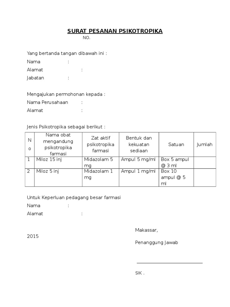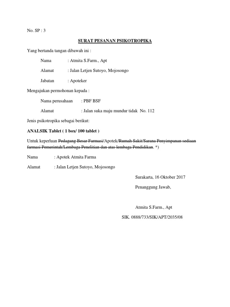 Surat pesanan psikotropika. Surat yang digunakan oleh perusahaan biasanya berupa surat bisnis yakni surat surat resmi yang digunakan demi kelancaran dan kemajuan perusahaan tersebut. Selanjutnya adalah surat untuk pesanan obat jenis psikotropika. The modifmobilz.com team also provides the picture in top quality.