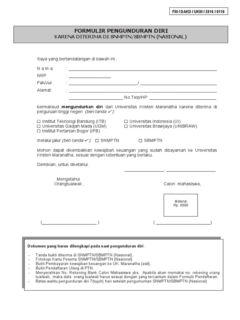 Selain itu, kamu perlu membuat surat permohonan pengunduran diri sebagai mahasiswa dengan template yang telah ditetapkan oleh setiap perguruan tinggi yang ditujukan kepada rektor. Diterima snptn/sbmptn perguruan tinggi.………………………………………….…………………………………………………………………………………………… demikian surat pengunduran diri ini saya buat dengan kesungguhan hati dan agar dapat dipergunakan sebagaimana mestinya. Tentunya dengan memperhatikan aturan penulisan surat resmi yang baik dan benar.