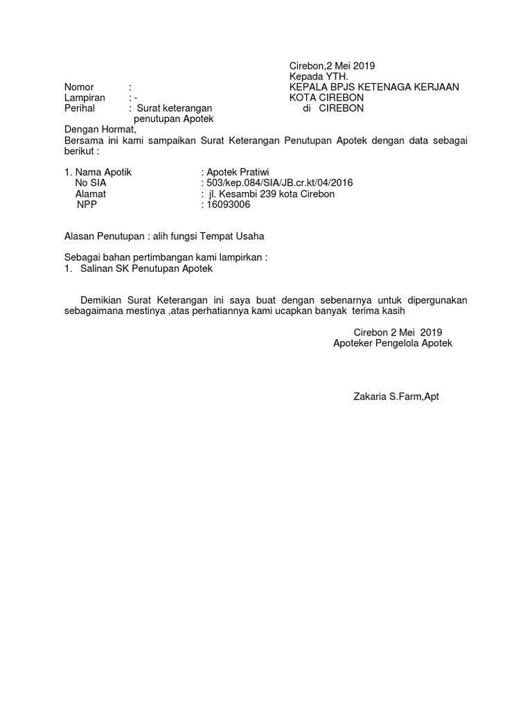 Contoh Surat Penutupan Perusahaan Untuk Bpjs Ketenagakerjaan