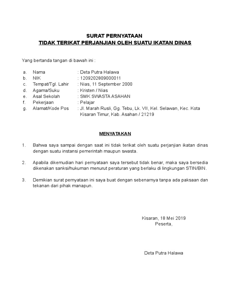 Surat Pernyataan Tidak Terikat Perjanjian Oleh Suatu Ikatan Dinas Deta Pdf
