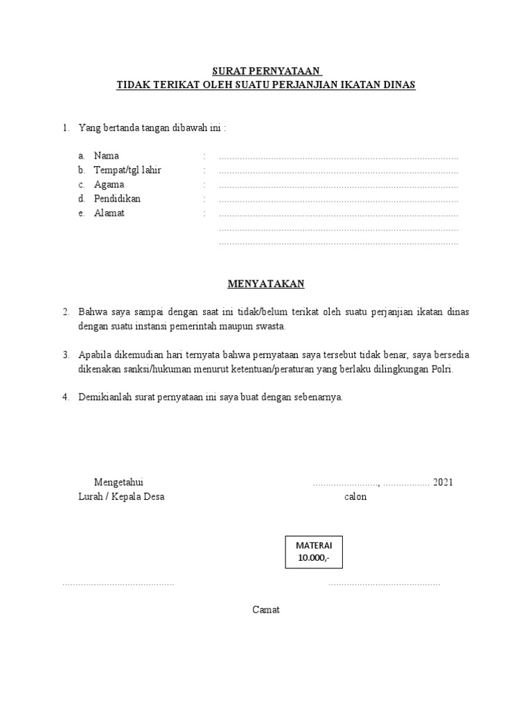 Apabila dikemudian hari ternyata bahwa pernyataan saya tersebut tidak benar, saya bersedia dikenakan sanksi/hukuman menurut ketentuan/peraturan yang berlaku dilingkungan polri. The collection that consisting of chosen picture and. Anda dapat melihat dengan jelas contoh surat perjanjian ikatan dinas menggunakan desktop anda, tablet, android atau iphone dan perangkat smartphone lainnya secara gratis.