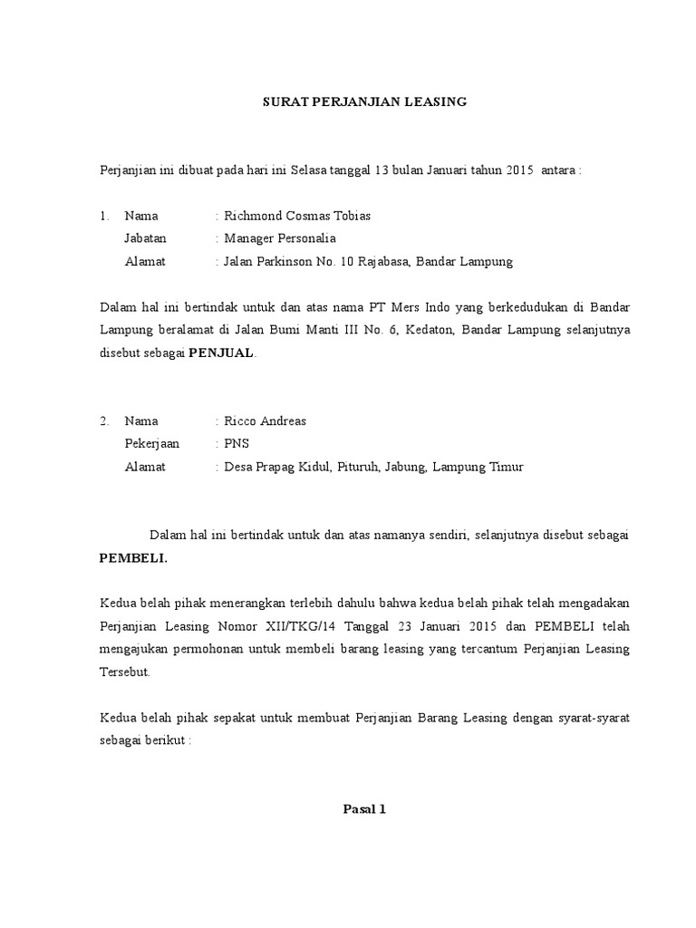 Terima kasih bibi rasinah nasihatun yang sudah mau berbagi membuatkan contoh surat perjanjian kontrak leasing , smoga contoh surat. Lihat juga tentang surat dan contoh surat perjanjian leasing pdf a short summary of this paper. Dalam hal ini bertindak untuk dan atas nama pt leny mega utama yang berkedudukan di tegal beralamat di jl.laban no.654 selanjutnya disebut penjual.