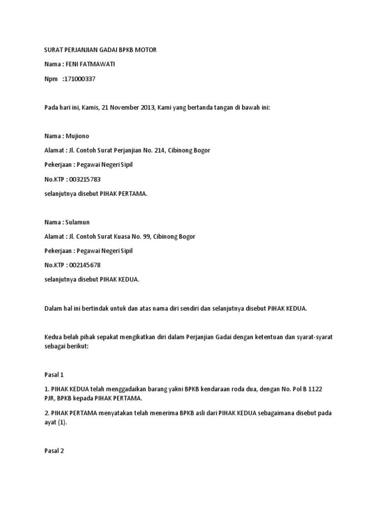 Surat Perjanjian Gadai Bpkb Motor Pdf