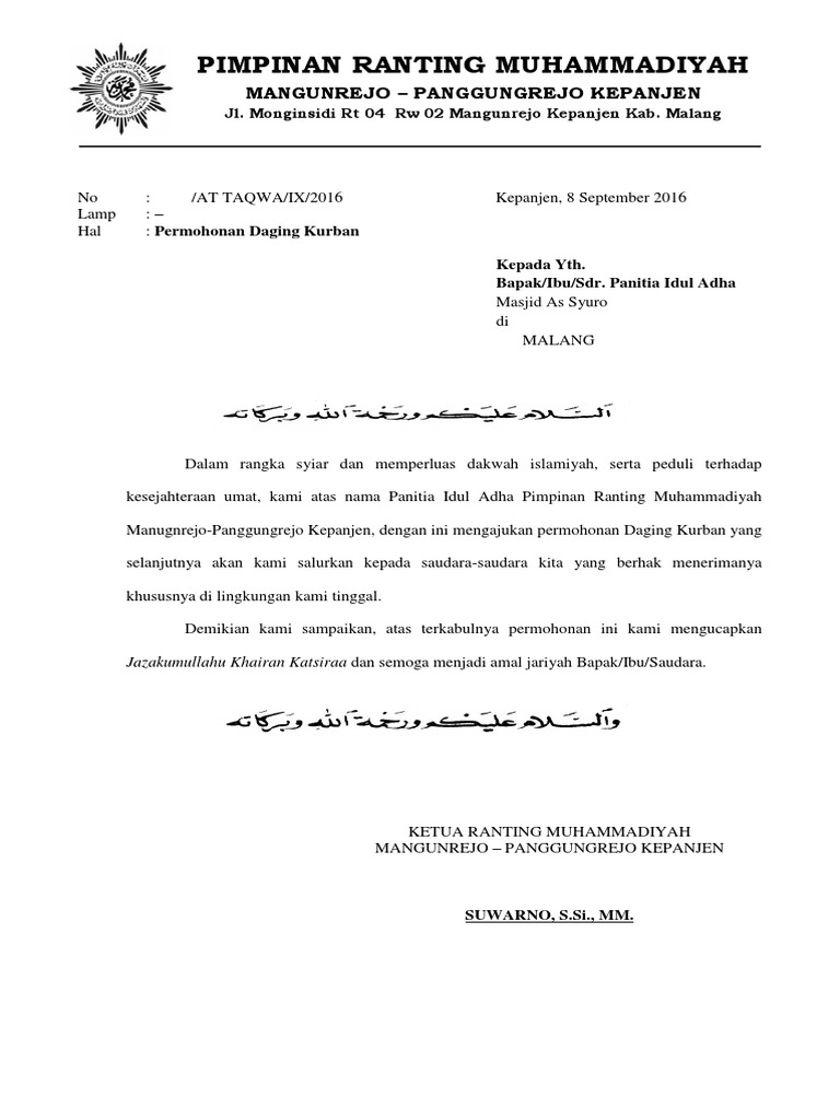 Contoh Surat Permohonan Hewan Qurban - Kumpulan Contoh Surat Dan Soal Terlengkap