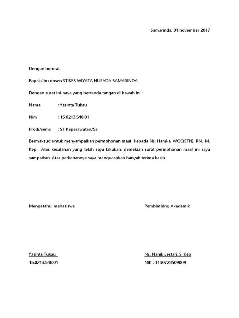 Ini isi surat permintaan maaf 131 tenaga magang pada pasien dan masyarakat suara kapuas raya. Surat permohonan maaf untuk bapak/ibu dosen dari mahasiswa tukang rebahan pas kuliah online Contoh surat permohonan maaf mahasiswa kepada dosen.