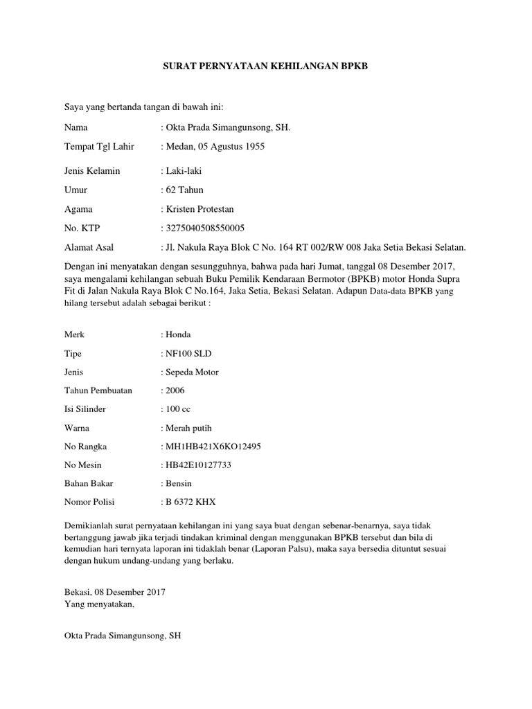 Contoh Surat Pernyataan Bpkb Hilang