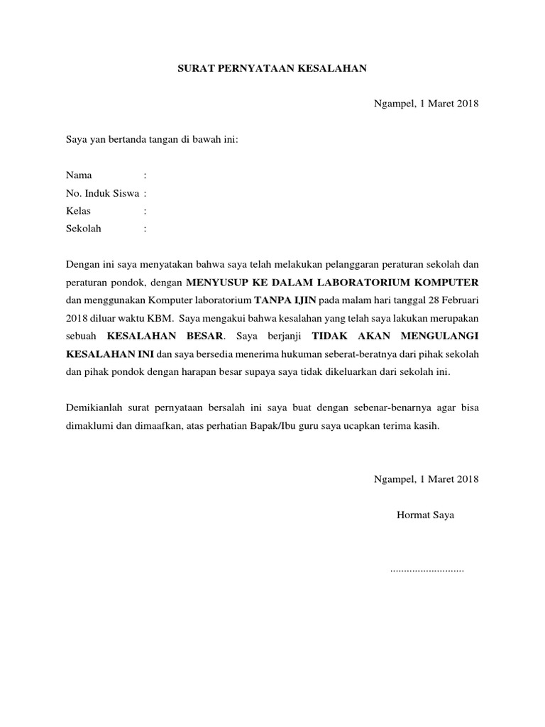 Create date 5 juli 2021. Surat pernyataan kesalahan adalah sebuah surat yang dibuat seseorang yang mana dia menyatakn bersalah telah melakukan sesuatu. Tak hanya di bangku sekolah, surat pernyataan ini juga bisa dibuat di lingkungan kerja atau organisasi.