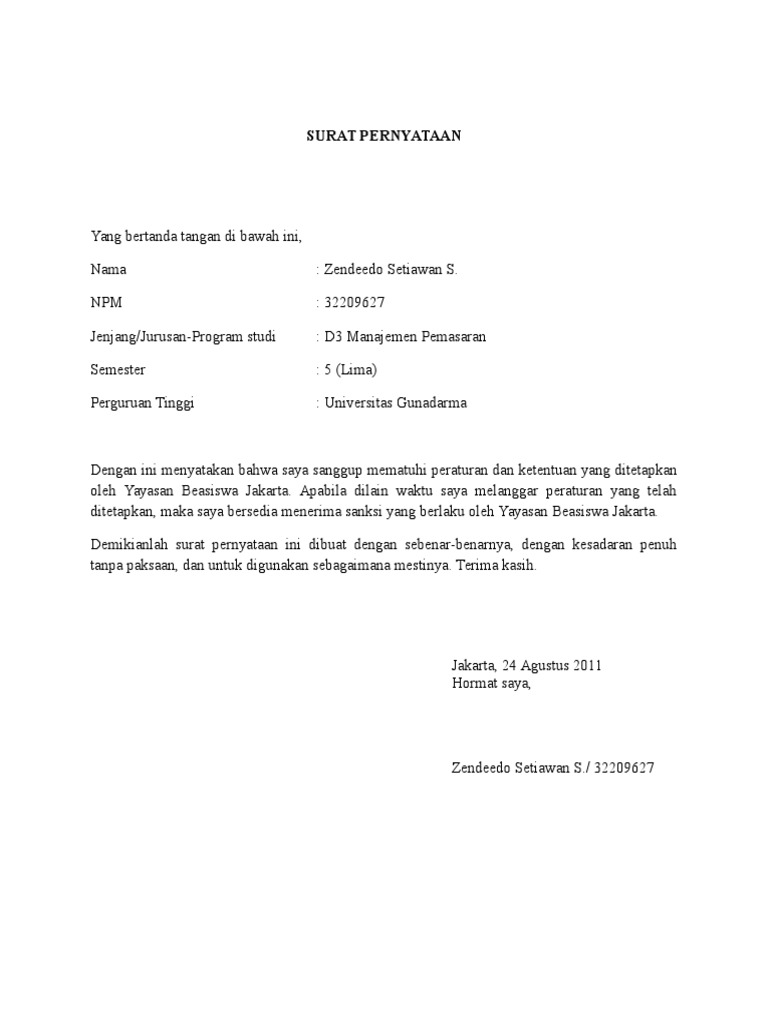 Dan/atau kerugian apapun yang timbul akibat pernyataan ini. Jadi intinya surat ini berisi tentang kesanggupan seseorang untuk dapat melakukan sesuatu. Surat keterangan sehat dari dokter, surat pernyataan menaati peraturan akademik.