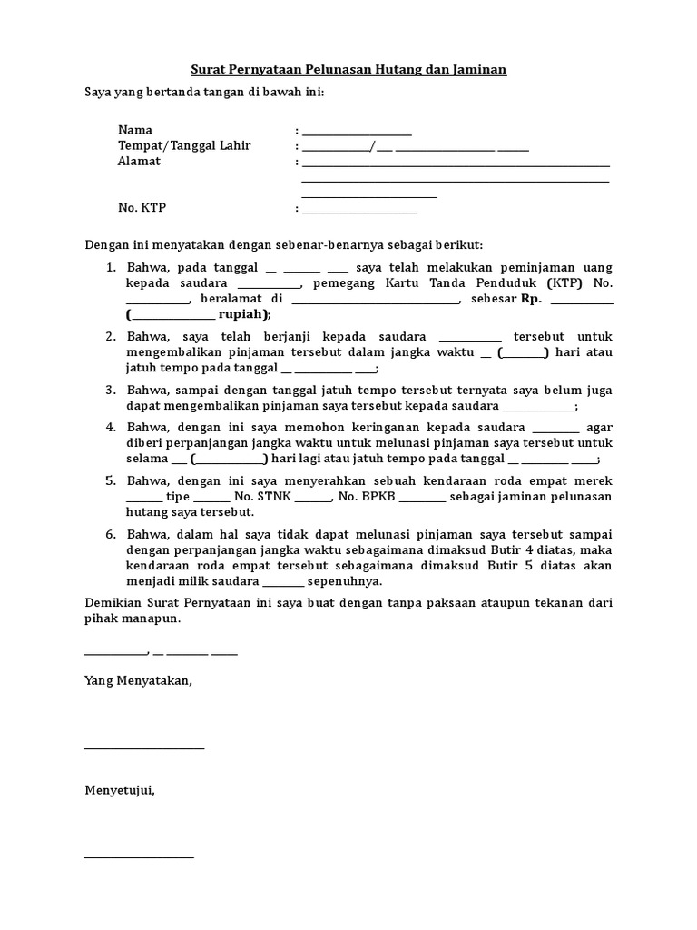Surat pernyataan pelunasan hutang dengan jaminan. Contoh surat perjanjian hutang piutang. View surat pernyataan pelunasan hutang dan jaminan.doc from aa 1surat pernyataan pelunasan hutang dan jaminan saya yang bertanda tangan di bawah ini:. Contoh di bawah ini bisa dipakai untuk membuat surat pernyataan pelunasan hutang pribadi kepada pihak lain seperti koperasi atau kartu kredit atau hutang.