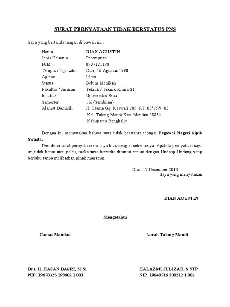 Surat Pernyataan Tdk Berstatus Pns Pdf