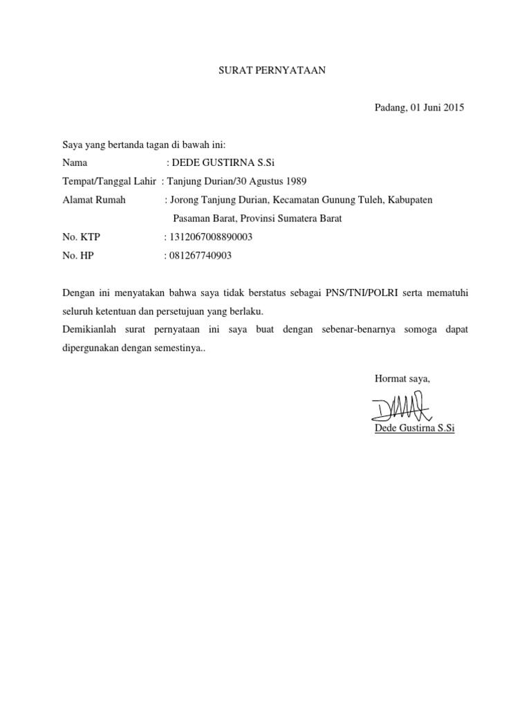 Contoh surat pernyataan tidak berstatus sebagai cpns pns. Surat harus memiliki gaya bahasa yang mudah dibaca dan dipahami khususnya surat resmi. Yayasan dan saya tidak berstatus sebagai pegawai negeri sipil pada instansi lain, anggota tni/ polri aktif, karyawan, guru, dosen tetap pada pts lain.