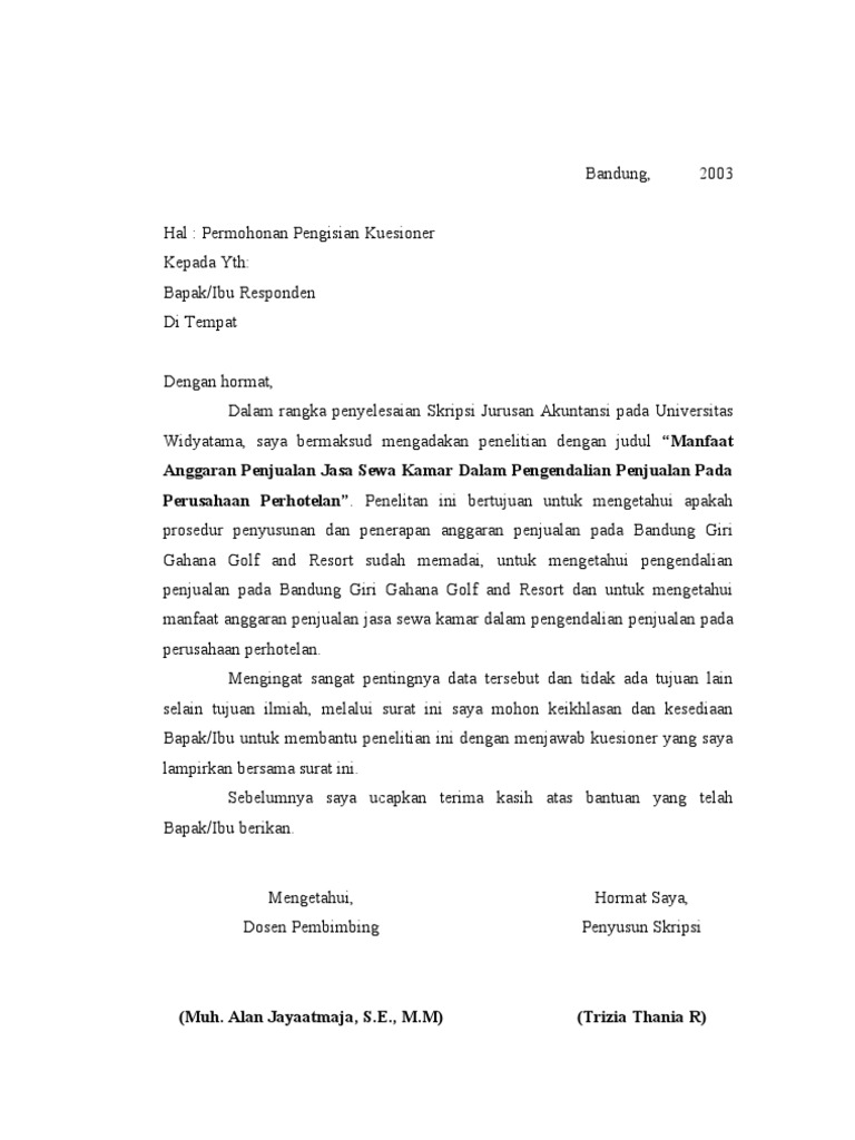Contoh Surat Permohonan Ke Responden Untuk Mengisi Kuesioner - Kumpulan Surat Penting
