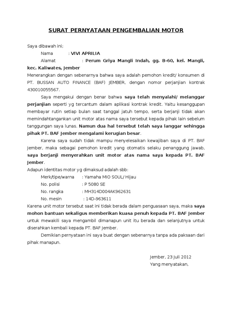 Surat Pernyataan Pengembalian Unit Pdf
