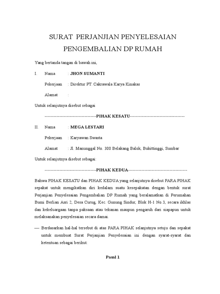 Pernjanjian Pengembalian Dp Rumah Pdf