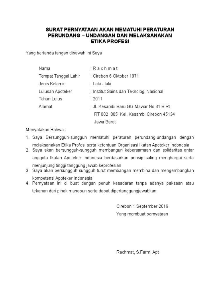 Pas photo ukuran 3 x 4 sebanyak 2 lembar. 15 contoh surat pernyataan kesanggupan untuk. Surat pernyataan mematuhi peraturan perundang undangan dan etika profesi 889/menkes/per/v/2011 tentang registrasi, izin praktik, dan izin kerja tenaga kefarmasian saya koreksi karena ada yang salah pada tanggal 3 mei 2011, kementerian kesehatan republik indonesia telah mengeluarkan peraturan menteri kesehatan nomor.