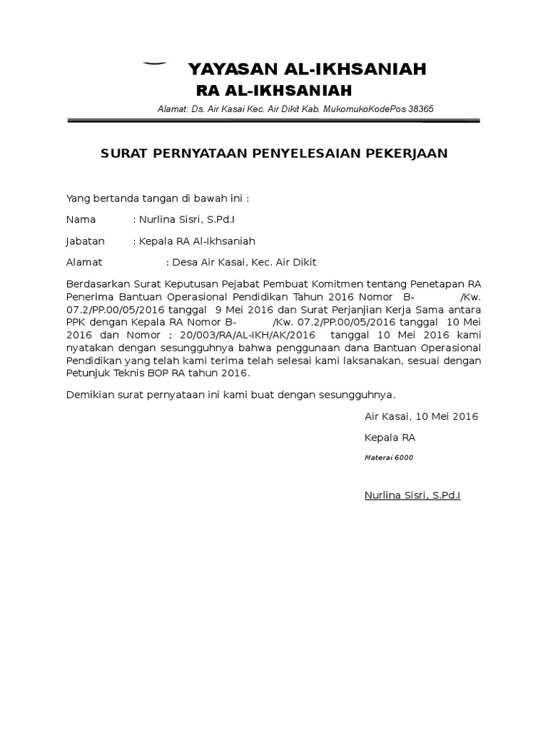 Contoh Surat Pernyataan Penyelesaian Pekerjaan Dana Bop Tk Ra Desa