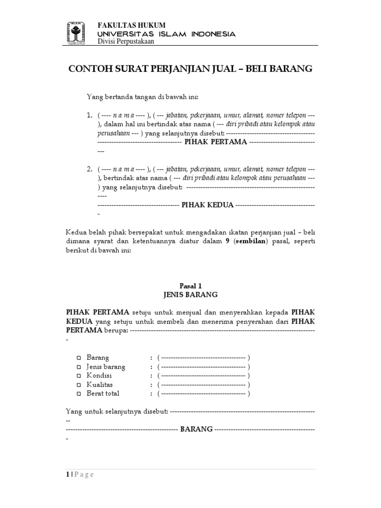 Contoh Surat Perjanjian Jual Beli Barang - Bagi Contoh Surat