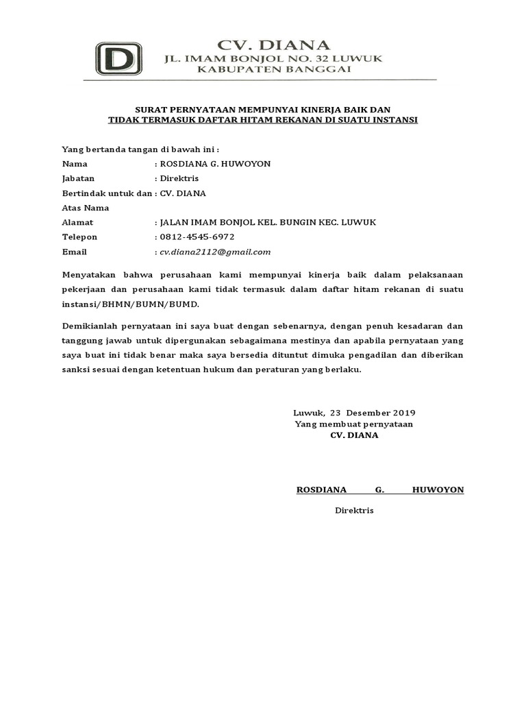 Contoh surat pernyataan tidak masuk dalam daftar hitam. Dengan ini menyatakan dengan sebenarnya bahwa nama perusahaan kami yang tercantum diatas tidak sedang dinyatakan masuk dalam daftar hitam disuatu instansi manapun baik instansi pemerintah maupun swasta, perusahaan kami sampai saat ini mempunyai kinerja. Tatang teguh santoso alamat :