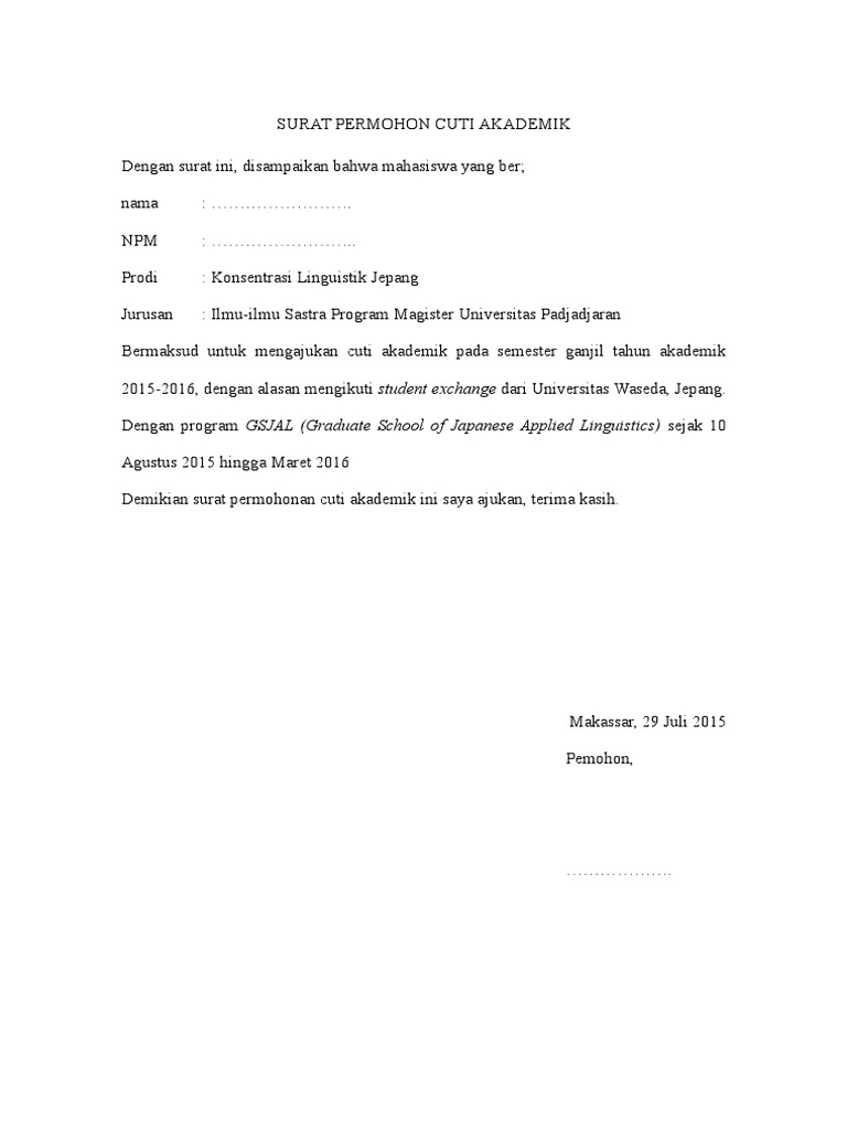 Surat permohonan cuti akademik. Surat permohonan cuti akademik yth. Berikut formulir permohonan cuti akademik Berikut ini adalah contohnya :