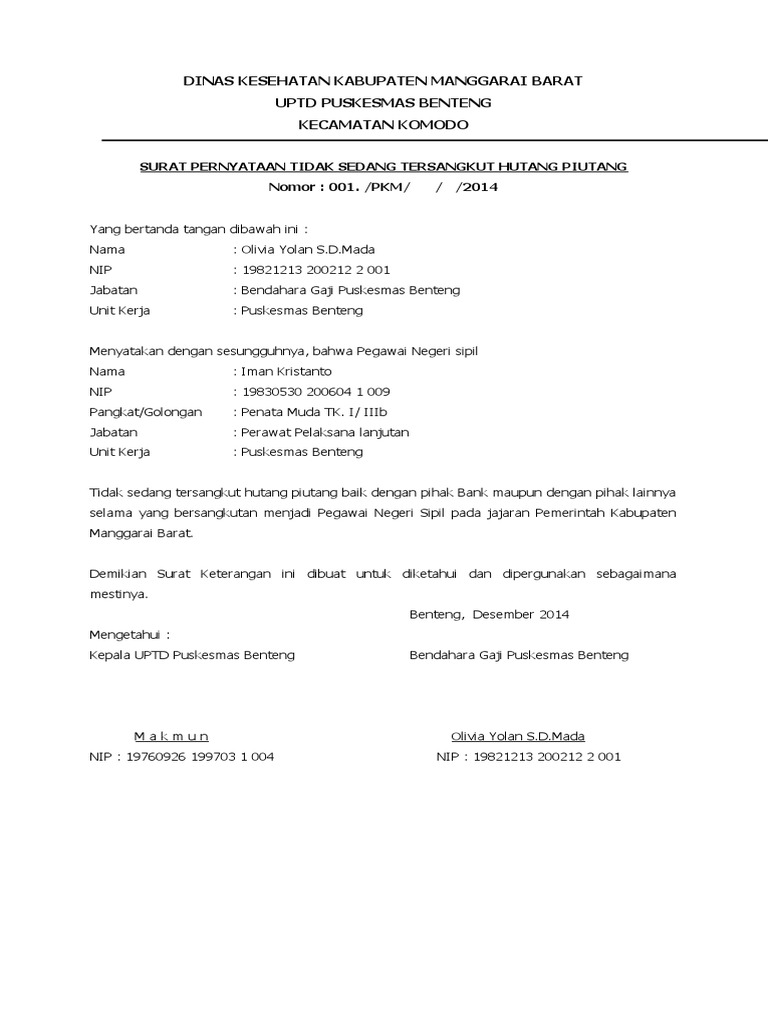 Surat pernyataan hutang yang digunakan untuk menyatakan bahwa seseorang telah berhutang dan akan melunasi hutangnya sesuai dengan tanggal jatuh tempo. Contoh surat pernyataan bebas hutang piutang. Olivia yolan s.d.mada nip :