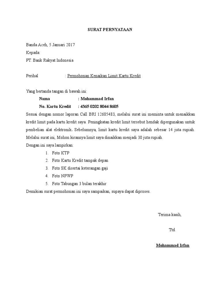 Contoh surat pernyataan kenaikan limit kartu kredit. Tidak lagi mengandalkan nomor hp indonesia. Saya keluarga melunasi kpr mandiri.