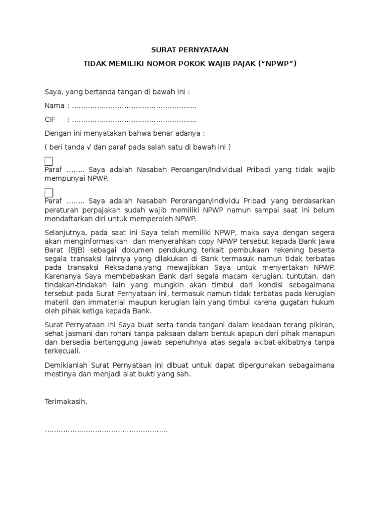 Surat keterangan tidak memiliki nomor pokok wajib pajak. Tidak memiliki nomor pokok wajib pajak (npwp) sehubungan dengan persyaratan pembukaan rekening pada bank jateng, saya yang bertanda tangan dibawah ini. Jadi tinggal isi formnya kemudian tandatangan dengan materai 6000 lalu kirim.