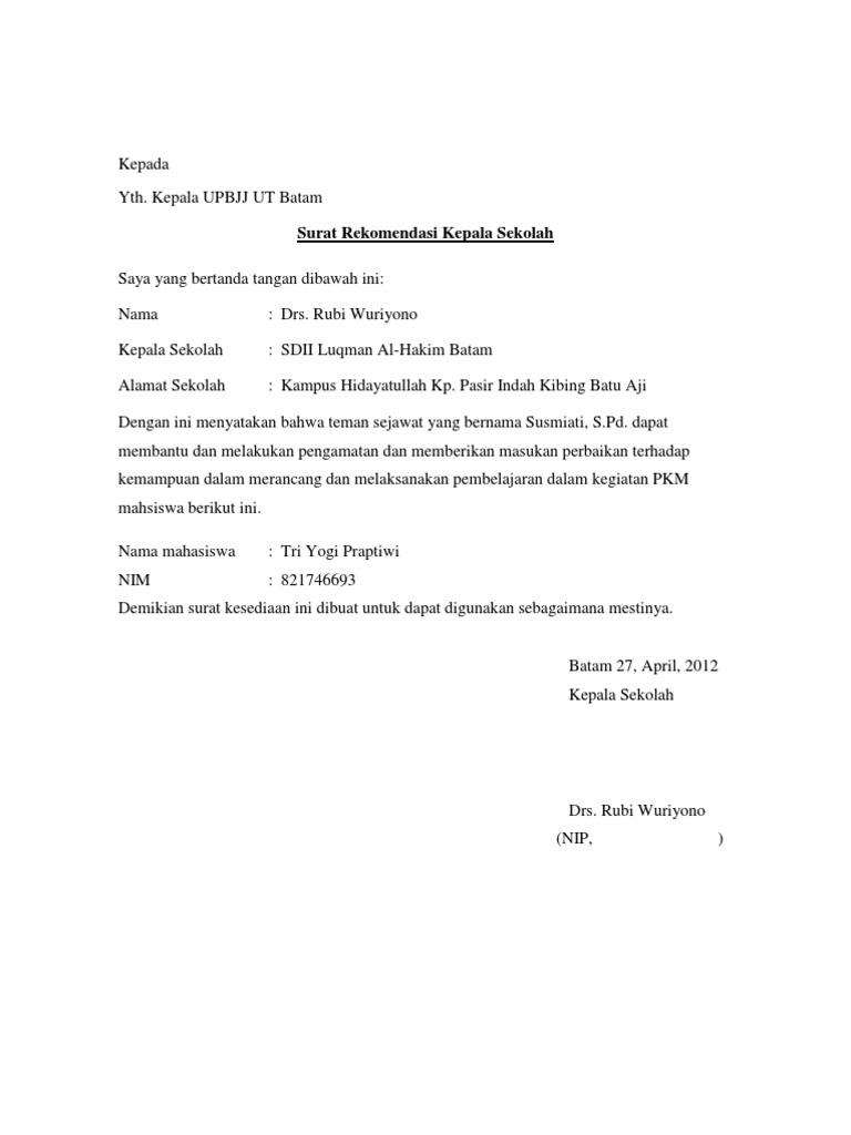 Contoh Surat Rekomendasi Kepala Sekolah - Nusagates