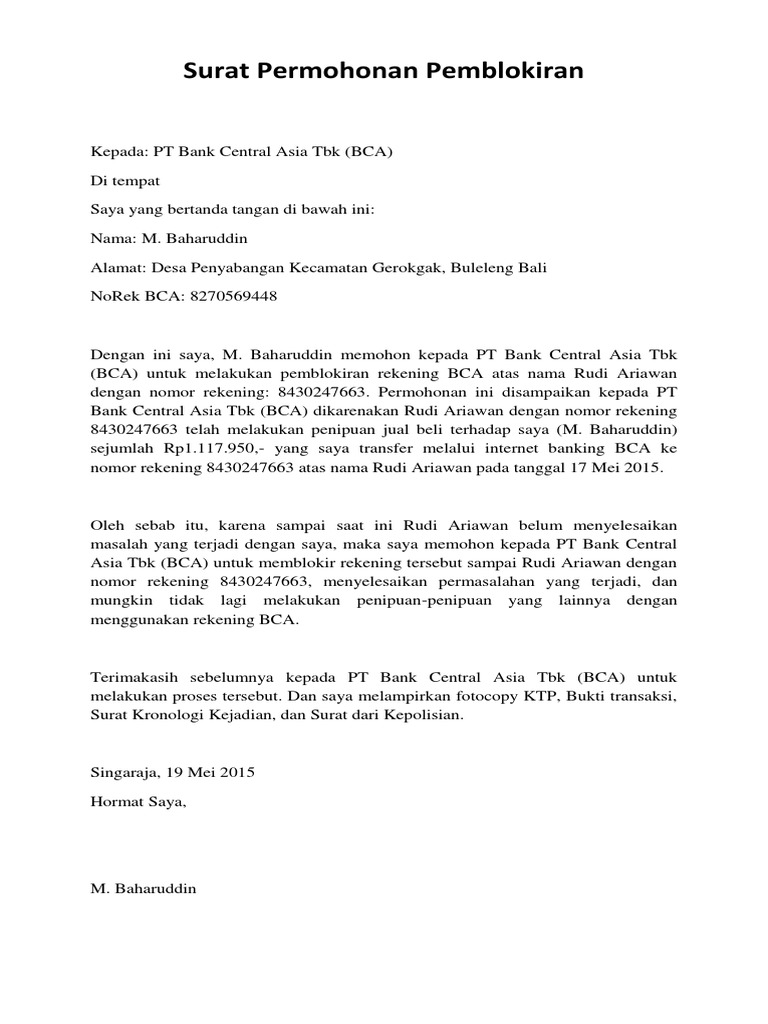Baharuddin memohon kepada pt bank central asia tbk (bca) untuk melakukan pemblokiran rekening bca atas nama rudi ariawan dengan nomor. Berikut adalah detail contoh surat permohonan pengukuran ulang tanah ke bpn. · fotokopi ktp · bukti transfer · surat permohonan pemblokiran rekening nasabah terlapor.