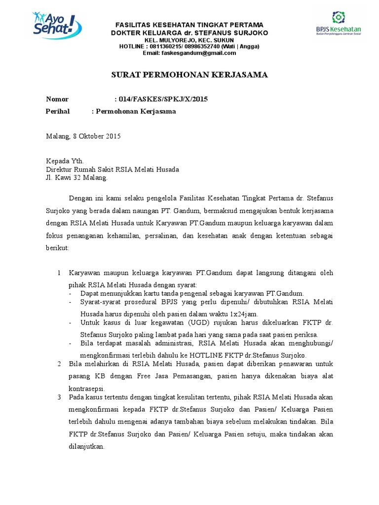 Sekian dulu penjelasan singkat mengenai contoh surat permohonan kerjasama dalam kesempatan kali ini. Jalan raya meganti km 3 9 malang. Secara singkat maka syarat kerjasama faskes dengan bpjs kesehatan dapat dirangkum sebagai berikut: