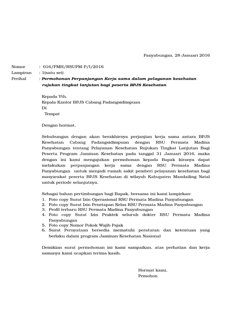 Permohonan perpanjangan kerja sama dalam pelayanan kesehatan rujukan tingkat lanjutan bagi peserta bpjs kesehatan kepada yth. Contoh surat permohonan perpanjangan kerjasama dengan bpjs from reader021.docslide.net liliek yang juga pemilik klinik provider bpjs kesehatan ini menjelaskan. Diharapakan informasi ini bisa berguna.