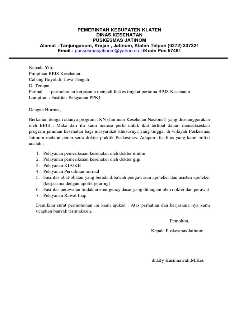 Contoh surat permohonan bergabung dengan bpjs kesehatan atas perusahaan berikut ini akan memberikan gambaran bagaimana format surat yang baik dan benar. Kali ini kami ingin berbagi informasi mengenai bagaimana cara klinik pratama mengajukan kerja sama dengan bpjs kesehatan untuk melayani pasien jaminan kesehatan nasional (jkn). Berikut ketentuannya sesuai permenkes nomor 71 tahun 2013 tentang pelayanan kesehatan pada jkn.