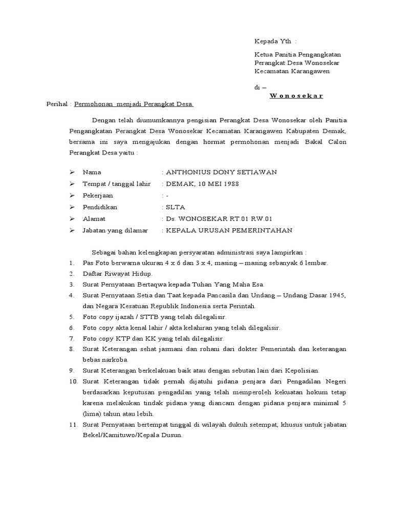 3, surat pernyataan setia kepada pancasila dan uud 1945. Surat permohonan menjadi perangkat desa yang. Lamaran / permohonan untuk menjadi calon perangkat desa mojoruntut kecamatan.