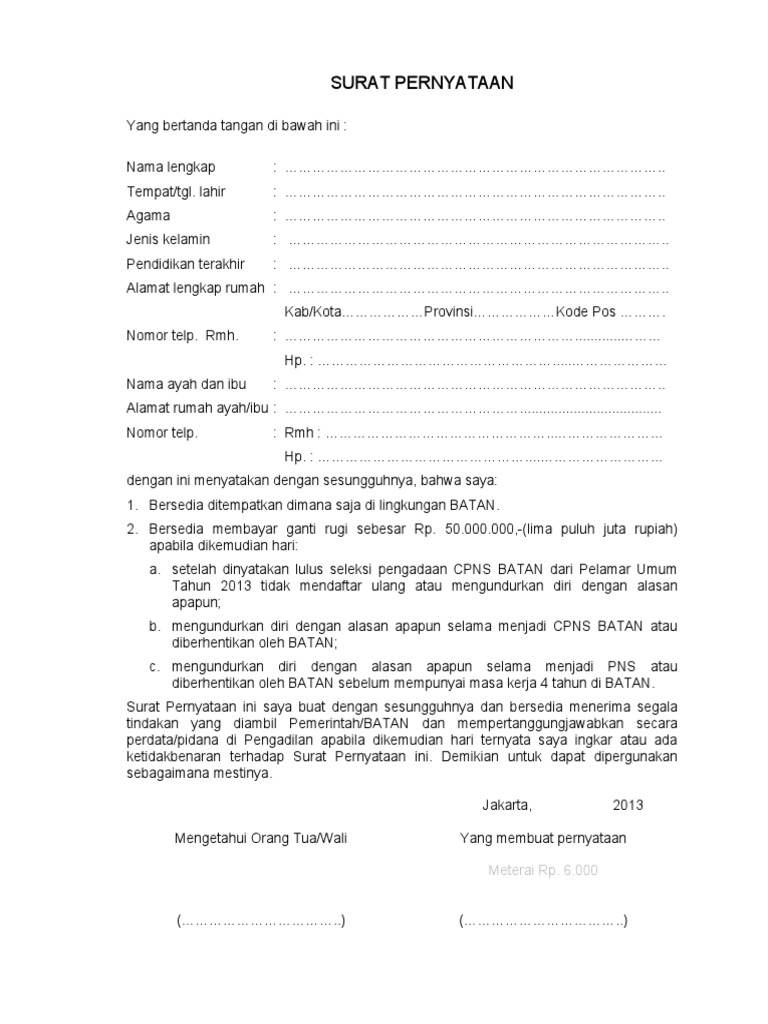 Contoh Surat Pernyataan Bersedia Membayar Ganti Rugi Untuk Pendaftaran Cpns - Bloggadogado