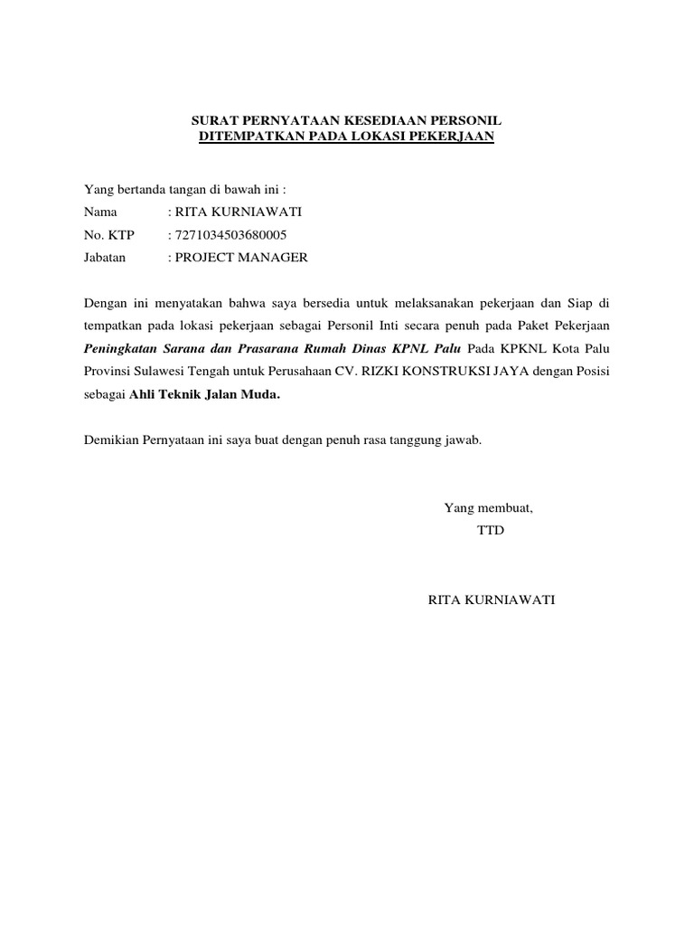 Surat Pernyataan Kesanggupan Melaksanakan Pekerjaan Proyek - Contoh surat pernyataan kesanggupan melaksanakan pekerjaan 8 sinopsis cerita anak dan hewan contoh dan penjelasan dongeng legendasage dan mitos jenis jenis mesin penggandaan dokumen makalah cara menjaga pola hidup sehat contoh surat perjanjian pinjam pakai gedung balai rw. Surat pernyataan kesanggupan ini biasanya dipergunakan untuk keperluan pekerjaan, dimana berguna untuk menerangkan kalau anda bersedia melaksanakan pekerjaan dengan resiko tertentu jika anda tidak bisa menepatinya.